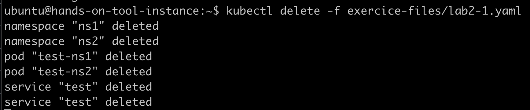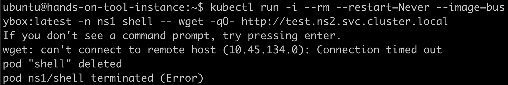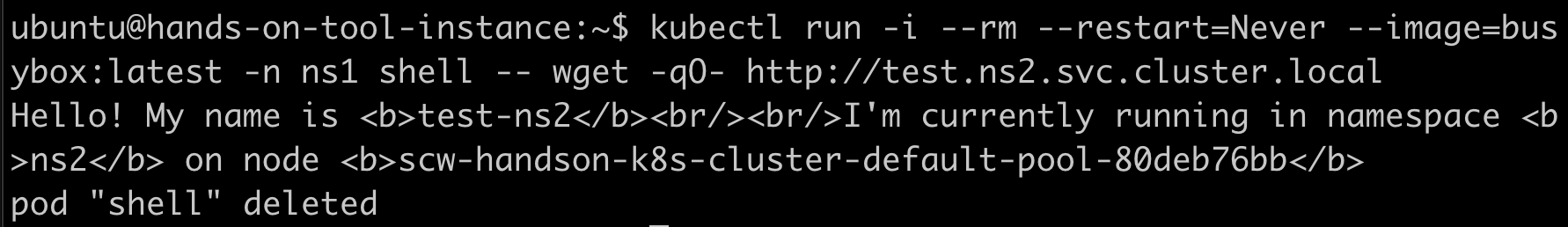 kubectl run -i --rm --restart=Never --image=busybox:latest -n ns1 shell -- wget -qO- http://test.ns2.svc.cluster.local