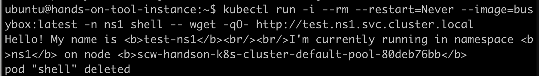 kubectl run -i --rm --restart=Never --image=busybox:latest -n ns1 shell -- wget -qO- http://test.ns1.svc.cluster.local