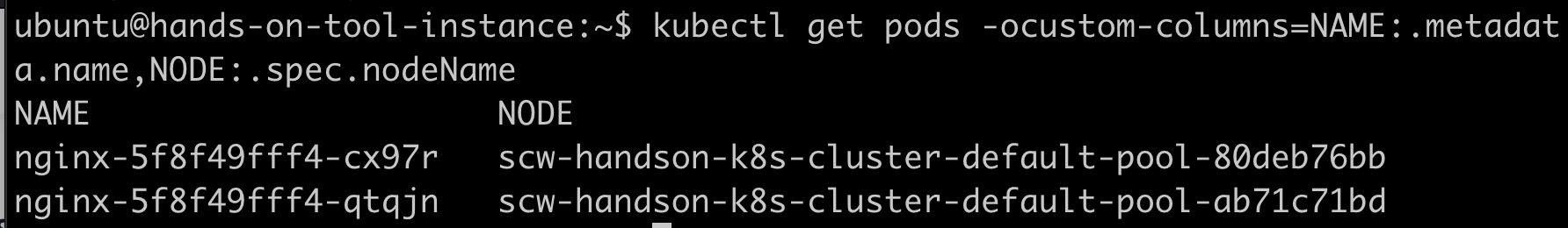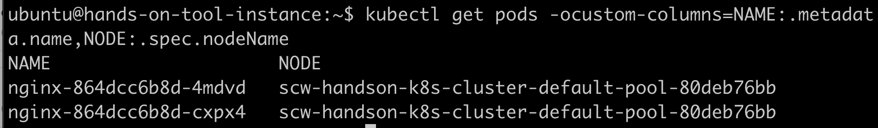 kubectl get pods -ocustom-columns=NAME:.metadata.name,NODE:.spec.nodeName
